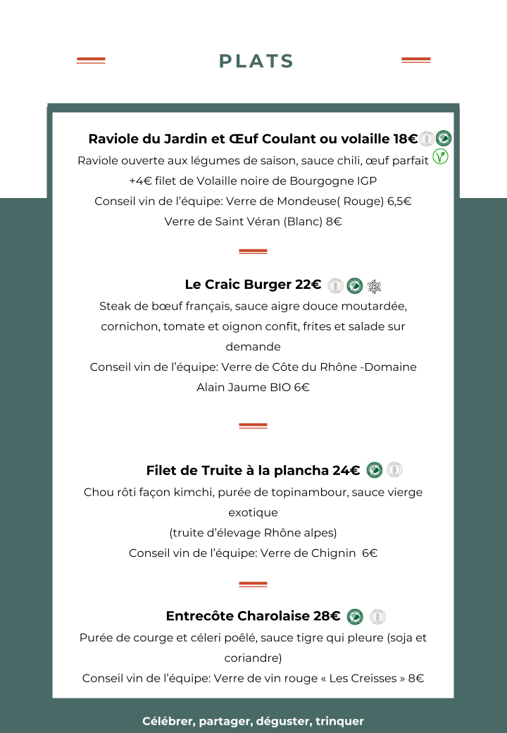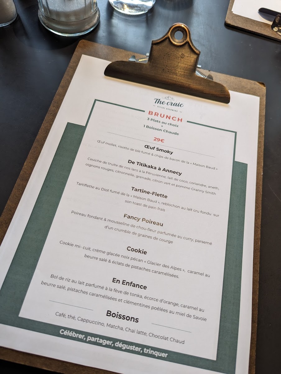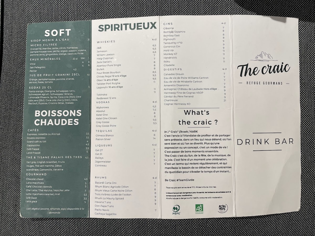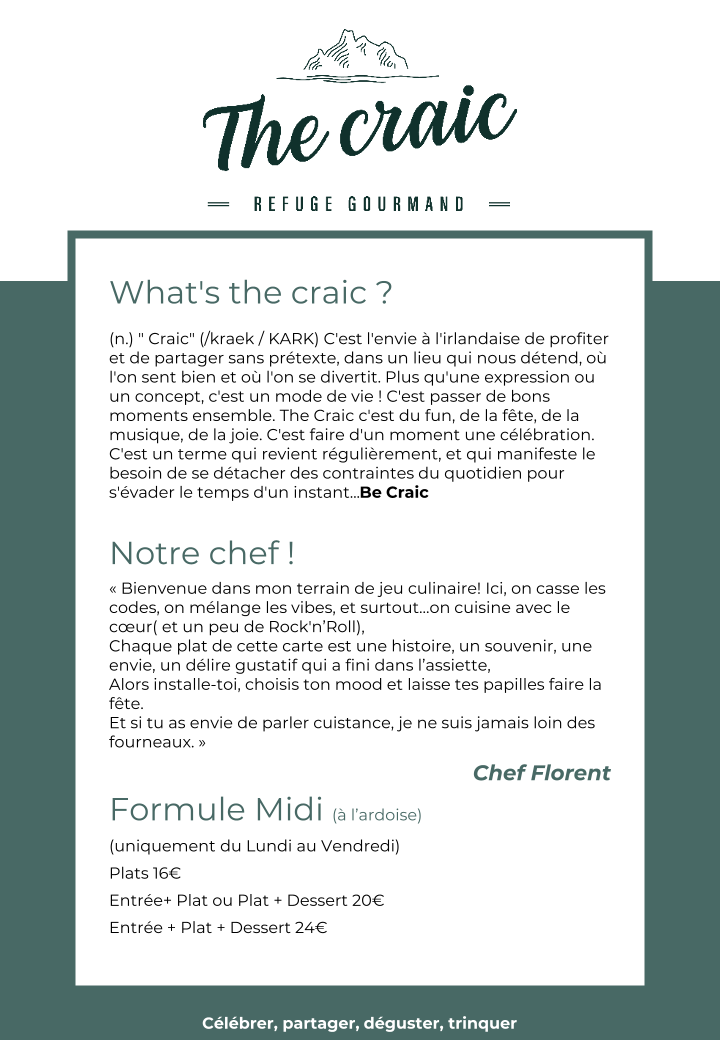 The Craic in Annecy offers a vibrant menu that beautifully blends fresh, high-quality ingredients with inventive flavors. The starters impress with bold creations like the Tataki de Bœuf, featuring marinated beef paired with lentils, orange, and a curcuma sauce, and the delicate Chou PakChoi braisé with a spicy soja vinaigrette. Moving to mains, the comforting Gnocchis de pomme de terre served with winter vegetables and Brézin cream stands out, alongside the wholesome Bowl Vitalité, a nutrient-packed quinoa dish accented by pomegranate and roasted squash. The Salade Shaker delights with layers of textures and tastes, including reblochon cromesquis and a honey vinaigrette. Desserts such as the classic Gâteau de Savoie with gentiane cream and the rich chocolate caramel cheesecake round off the experience on a sweet note. With attentive service and an inviting ambiance, The Craic presents a menu that balances tradition and creativity, making each dish a memorable moment.